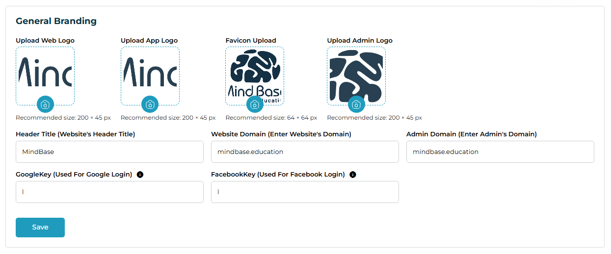 You can enable Google or Facebook login for your students and tutors & counselors by entering their respective API keys.