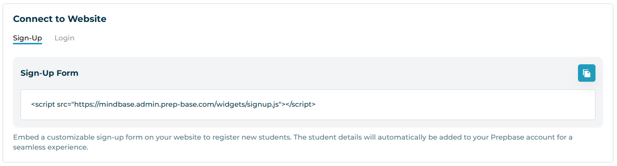 When you enter your Website Domain, PrepBase automatically generates a Sign-Up / Login widget script such as: