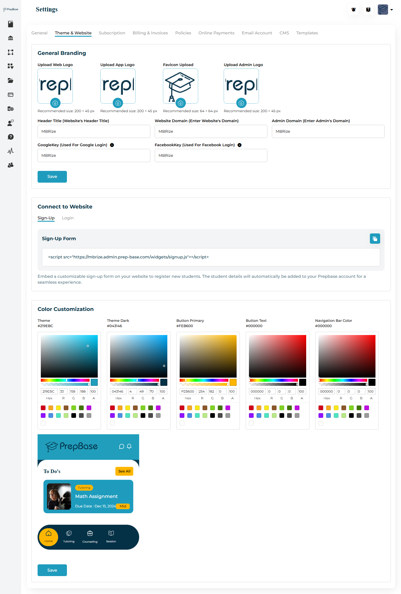 This section allows you to personalize your PrepBase interface with custom branding and color themes that reflect your organization’s identity.