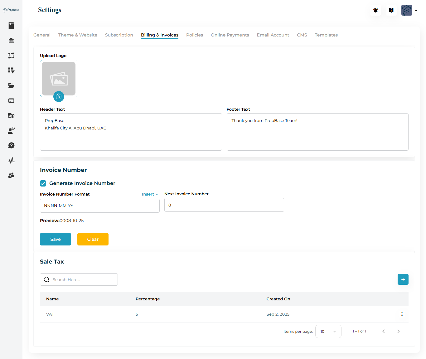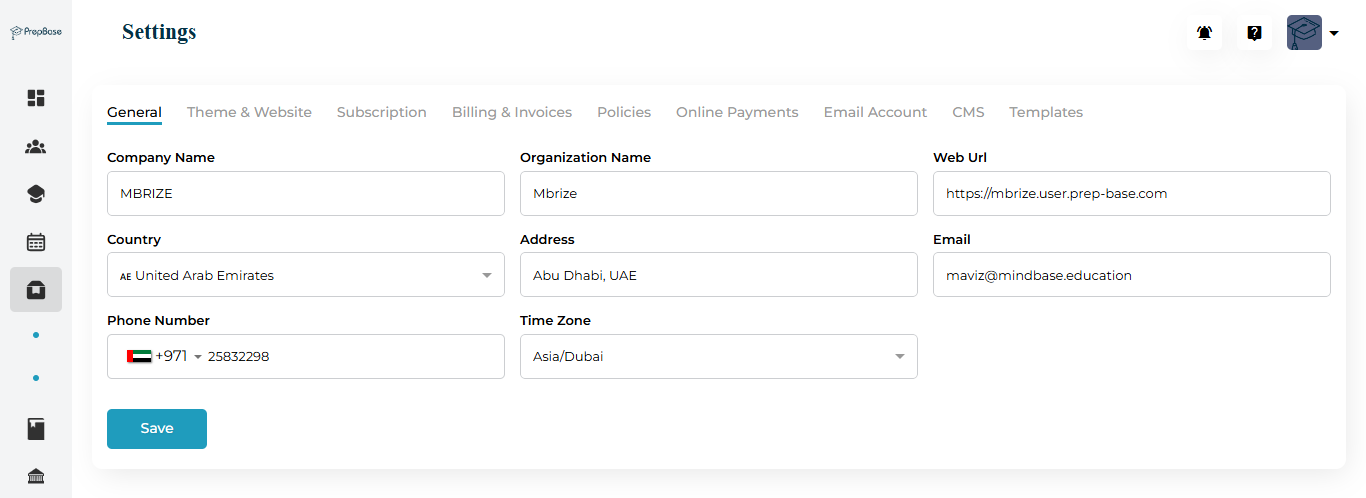 The Settings module in PrepBase allows administrators to configure and customize their organization’s platform preferences — from general information and branding to subscription management, billing, and system policies.