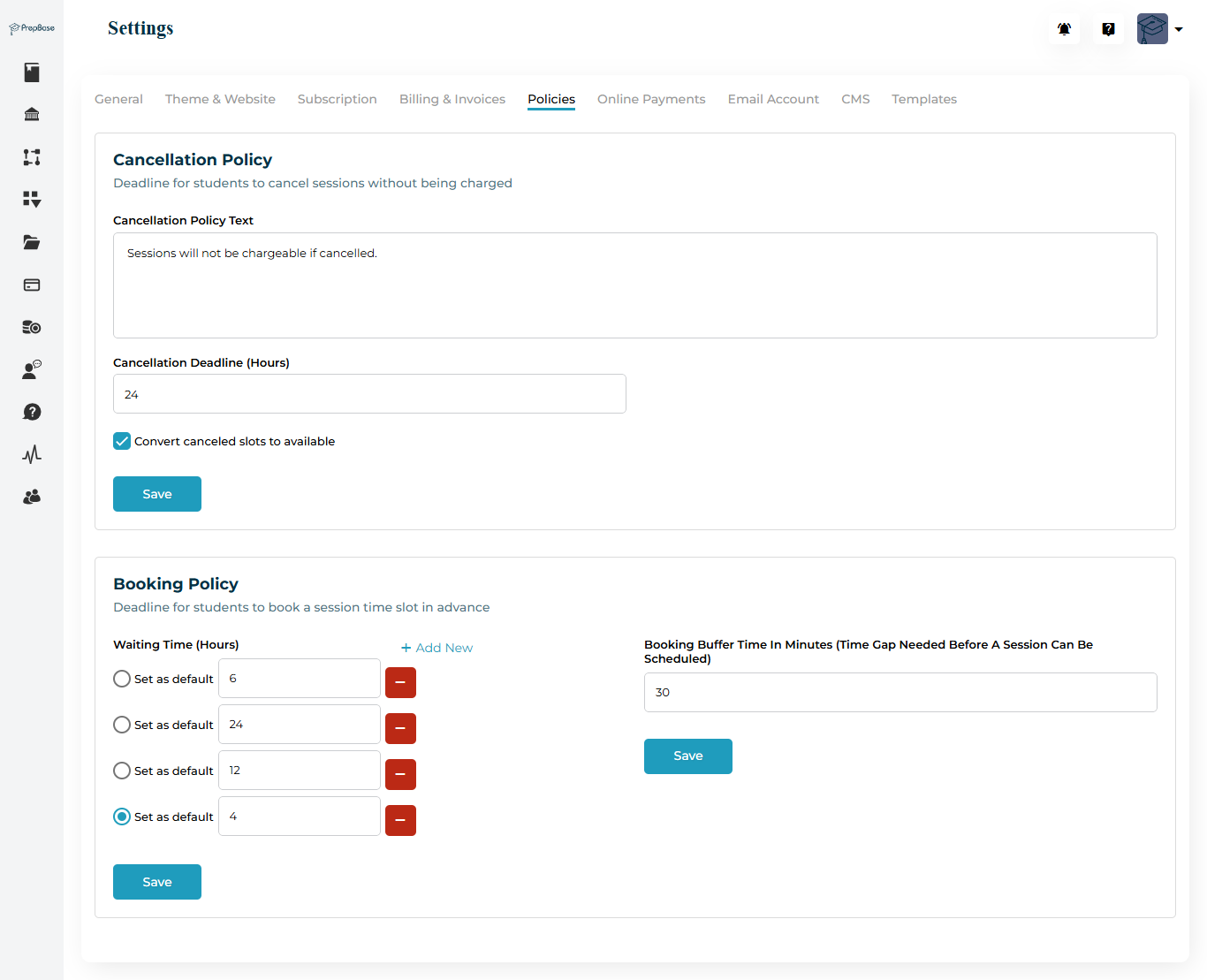 • Cancellation Deadline (Hours): How many hours before a session students can cancel without charge.