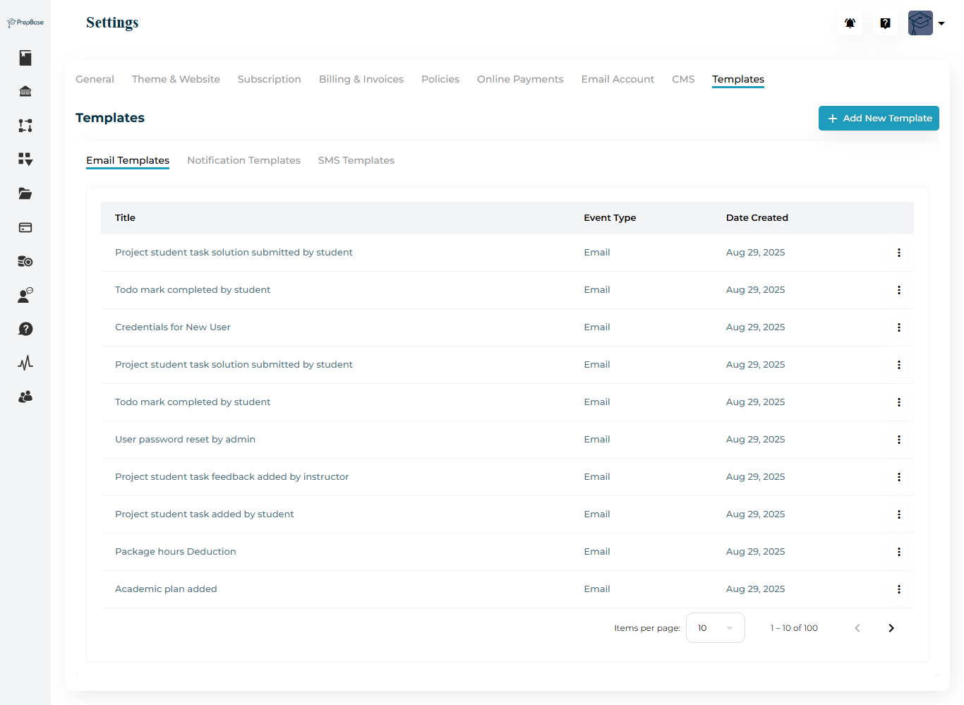 Manage all email, SMS, and notification templates used for automated communications in PrepBase.