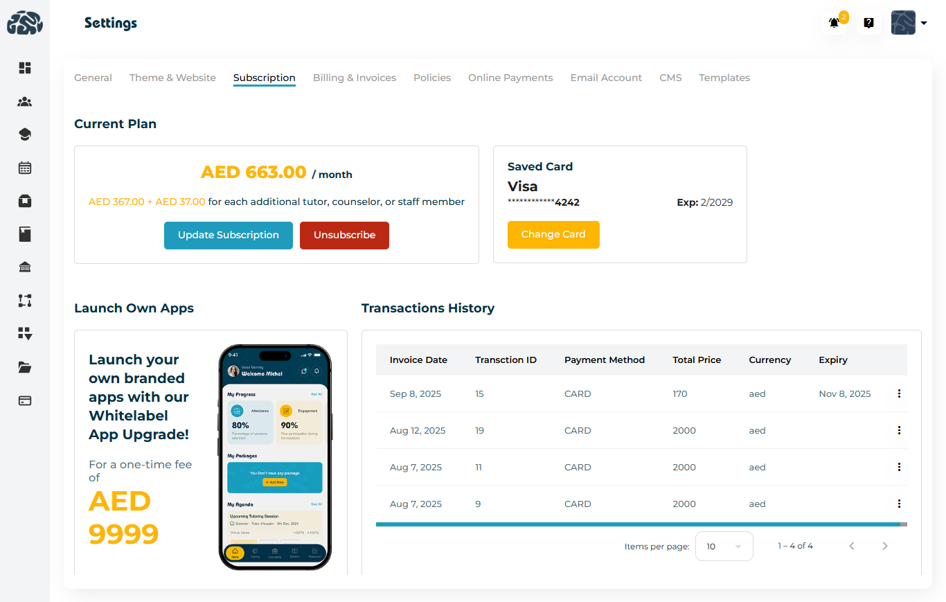 • You can update your saved card or payment details anytime within the Subscription tab.