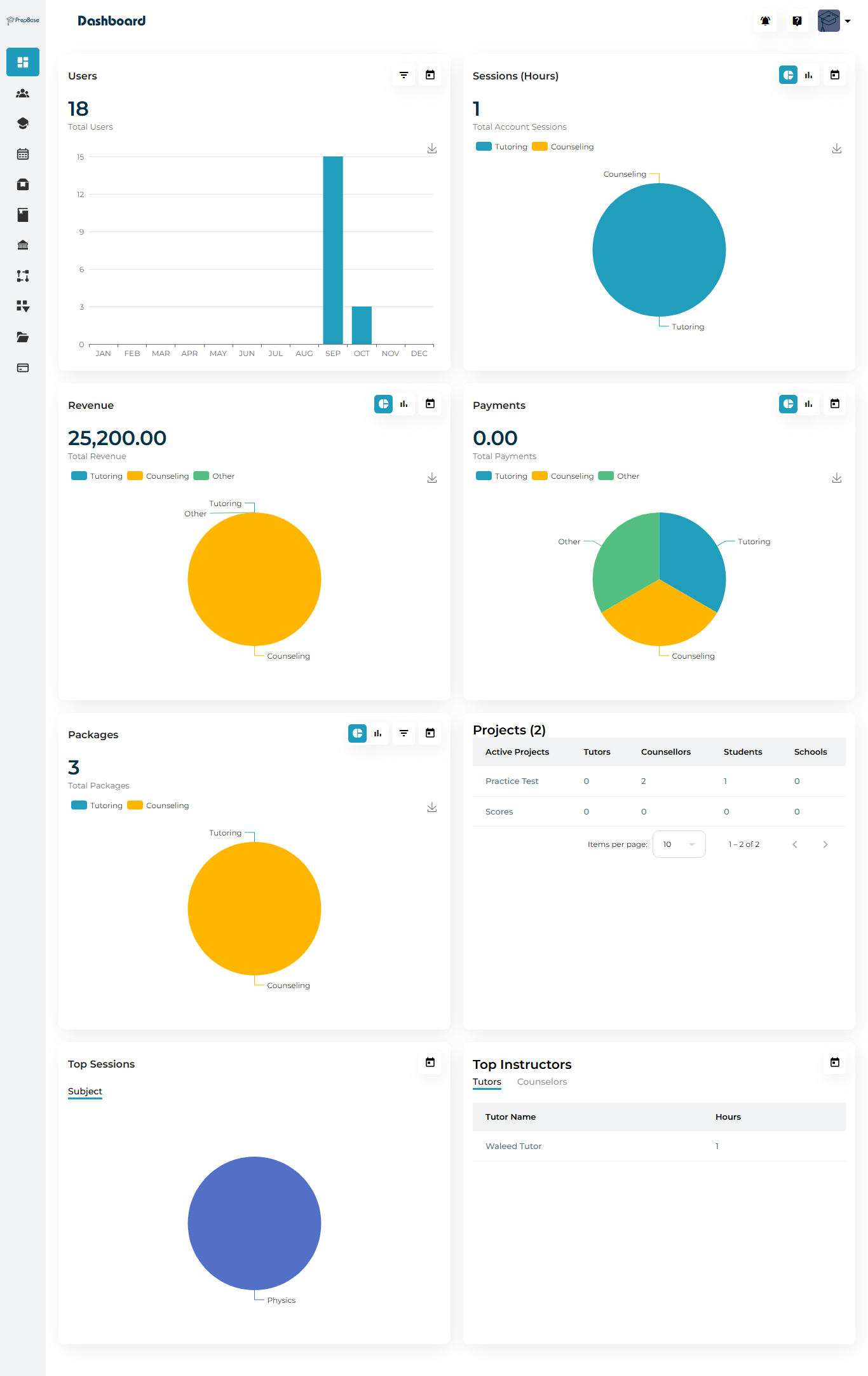 | Revenue | Tracks the total earnings generated through active tutoring and counseling packages. |