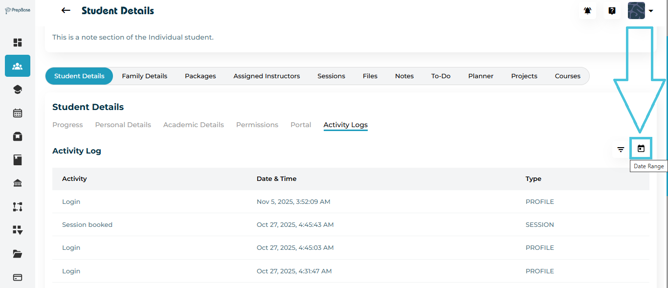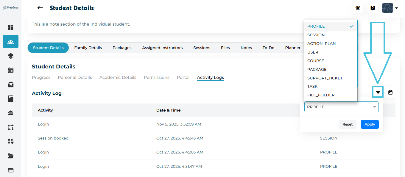 You’ll now see a detailed list of every action associated with that student — such as booked sessions, completed activities, and changes made to their profile.