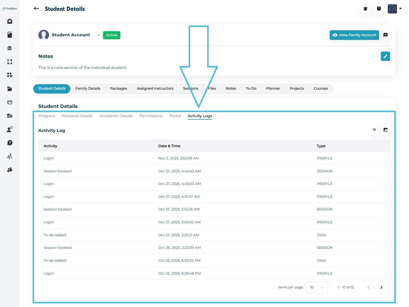 The Activity Logs tab in PrepBase gives a transparent record of each student’s interactions within the platform.