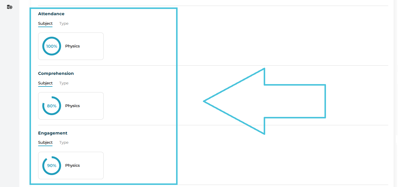 Displays key highlights of the student’s learning performance, including Attendance, Comprehension, and Engagement scores.