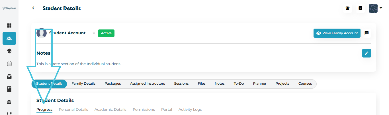 The Progress tab in PrepBase provides a complete overview of a student’s activities, session performance, and engagement levels — all in one place.