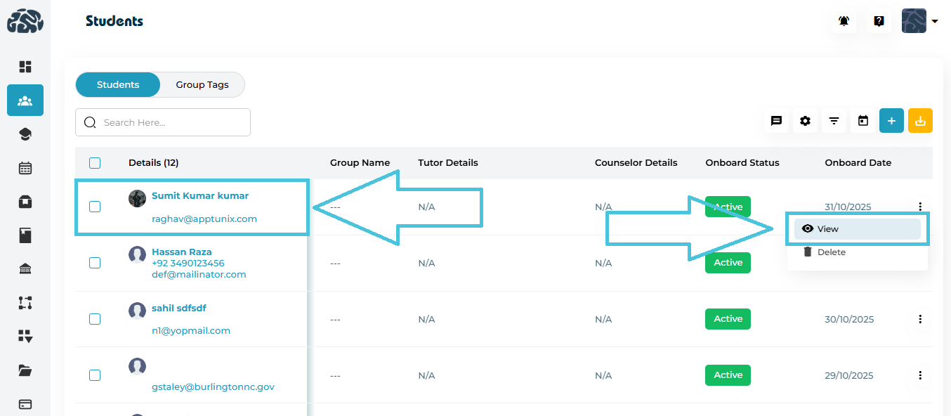 Administrators can access a student’s full profile using either of two options — directly clicking the student’s name or selecting View from the ⋮ (three-dot) action menu.