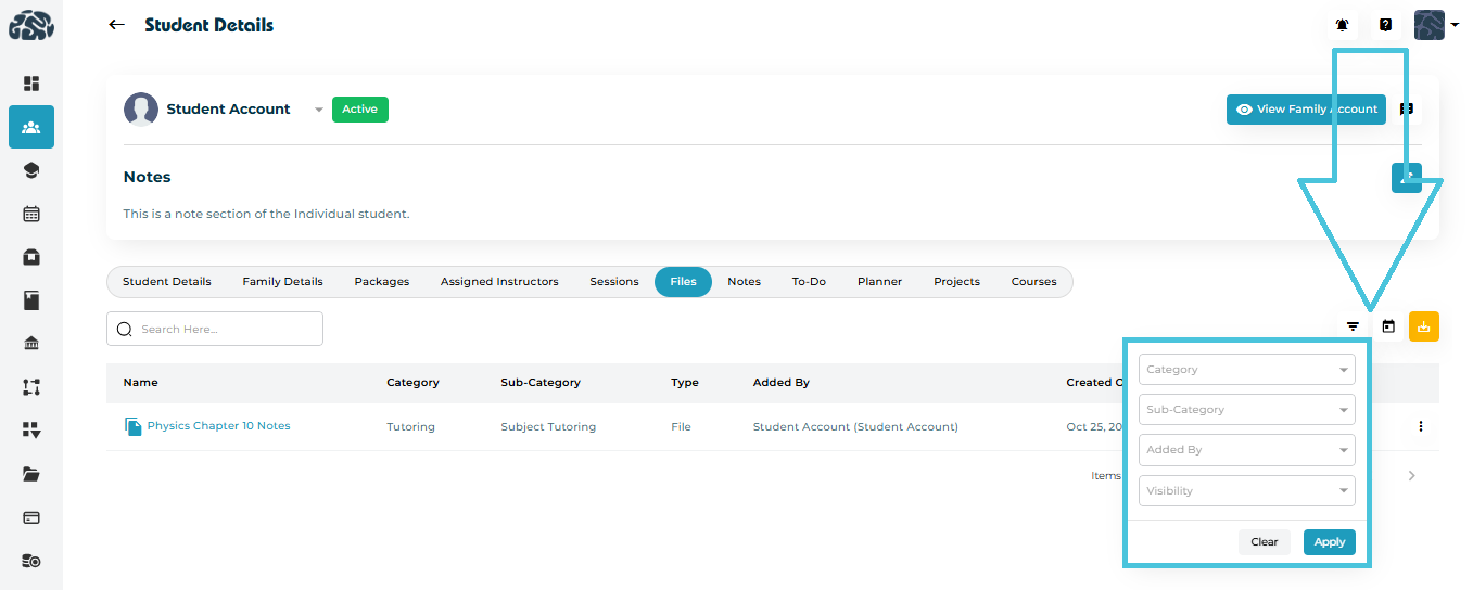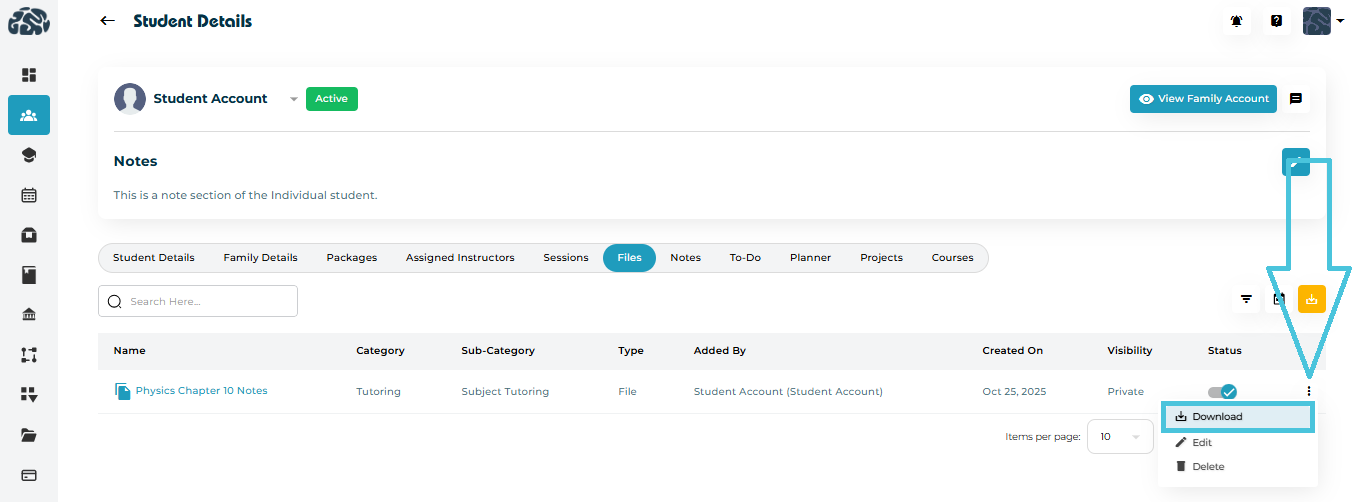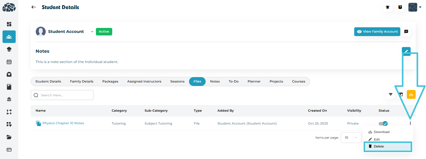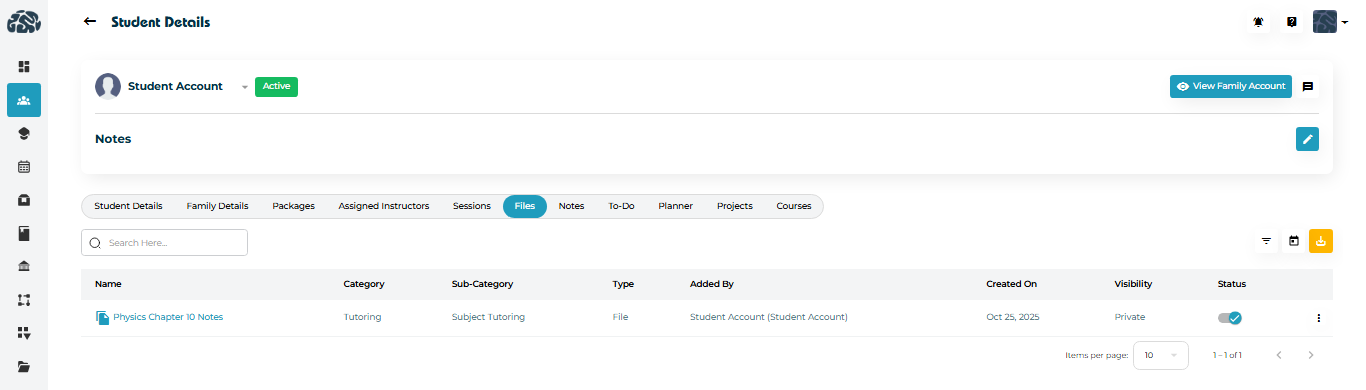 The Files tab within the Student Details page allows administrators to view and manage learning materials, session resources, and student documents.