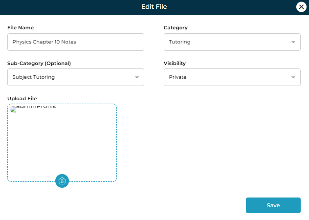 If an uploaded file needs re-categorization or visibility updates, Admins can edit its metadata.