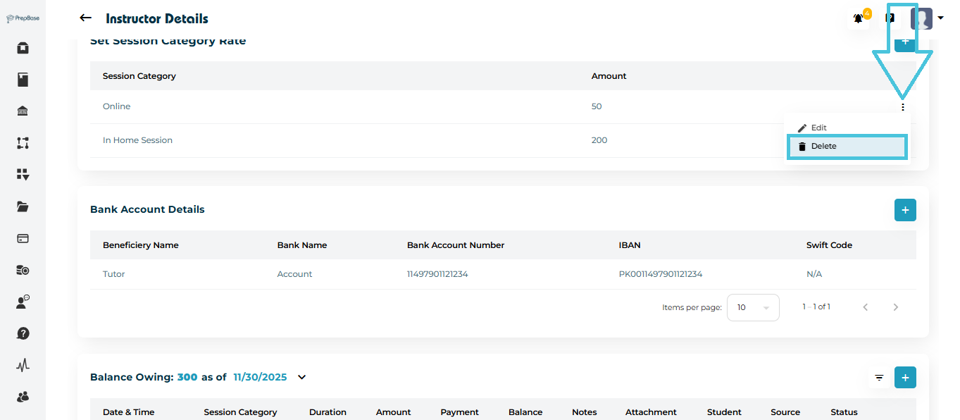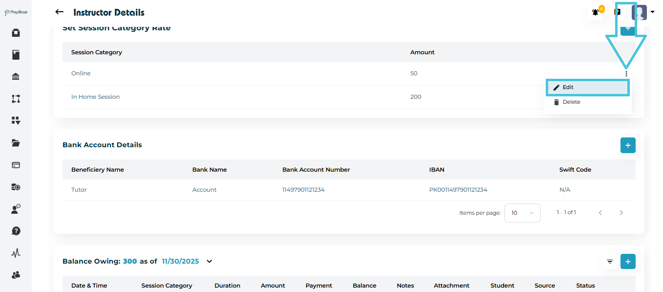 Instructor compensation in PrepBase is centralized under the Payroll section of each instructor’s profile. This area allows admins to configure hourly rates, assign session category pricing, and manage bank account details for payout processing.