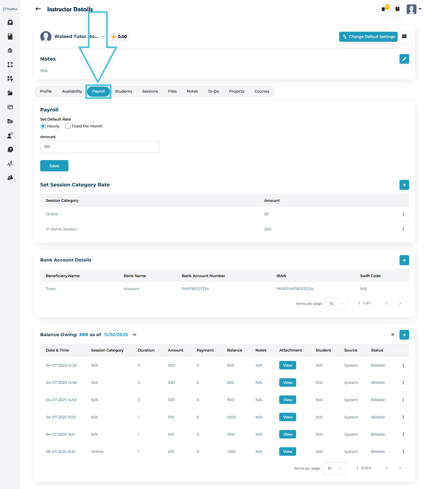 Instructor compensation in PrepBase is centralized under the Payroll section of each instructor’s profile. This area allows admins to configure hourly rates, assign session category pricing, and manage bank account details for payout processing.