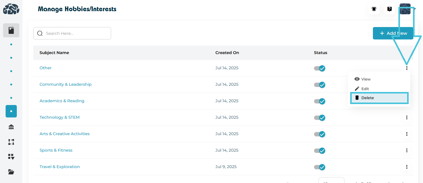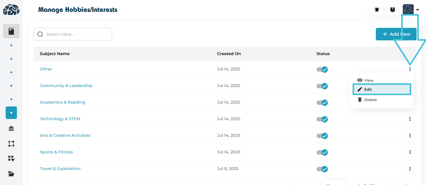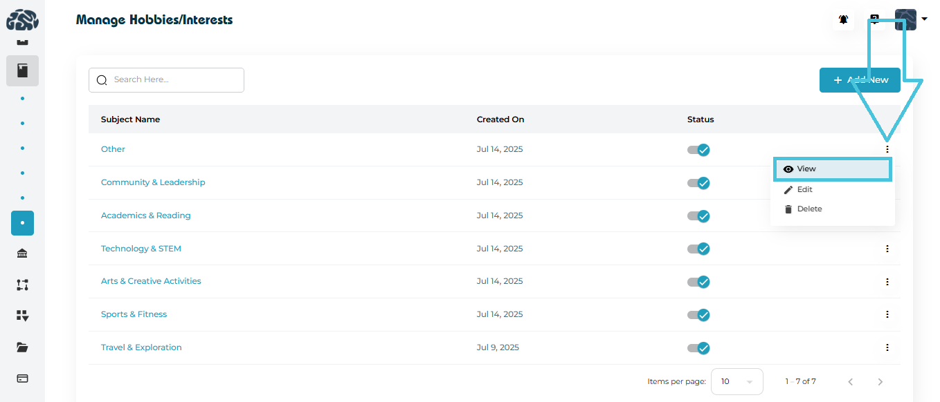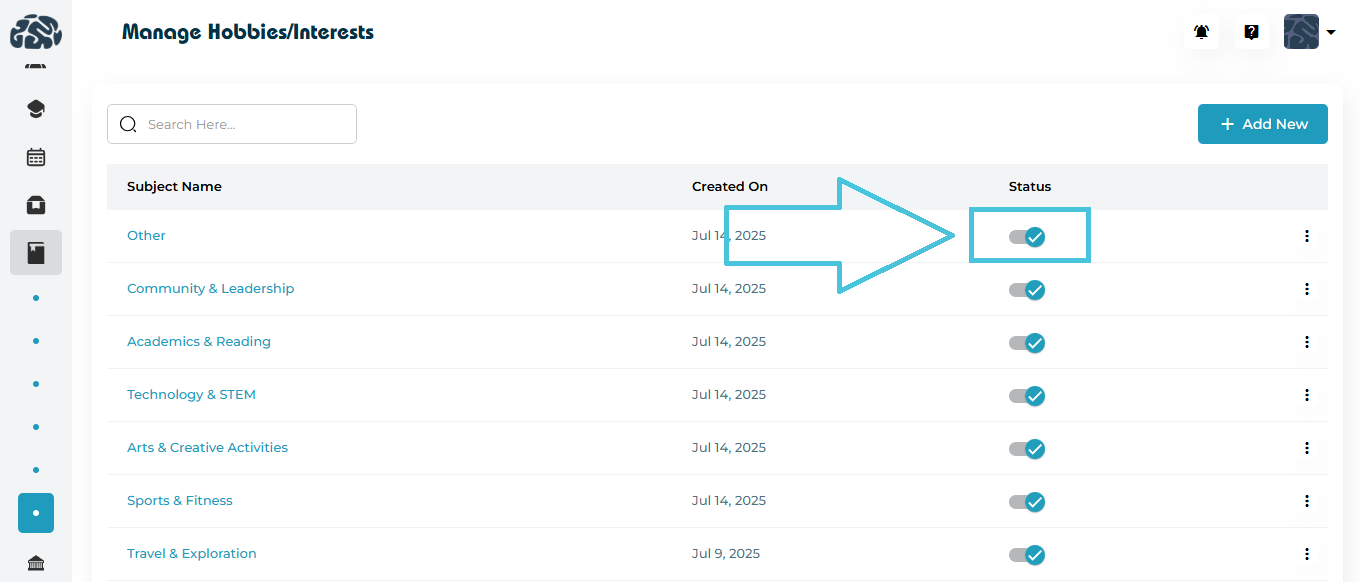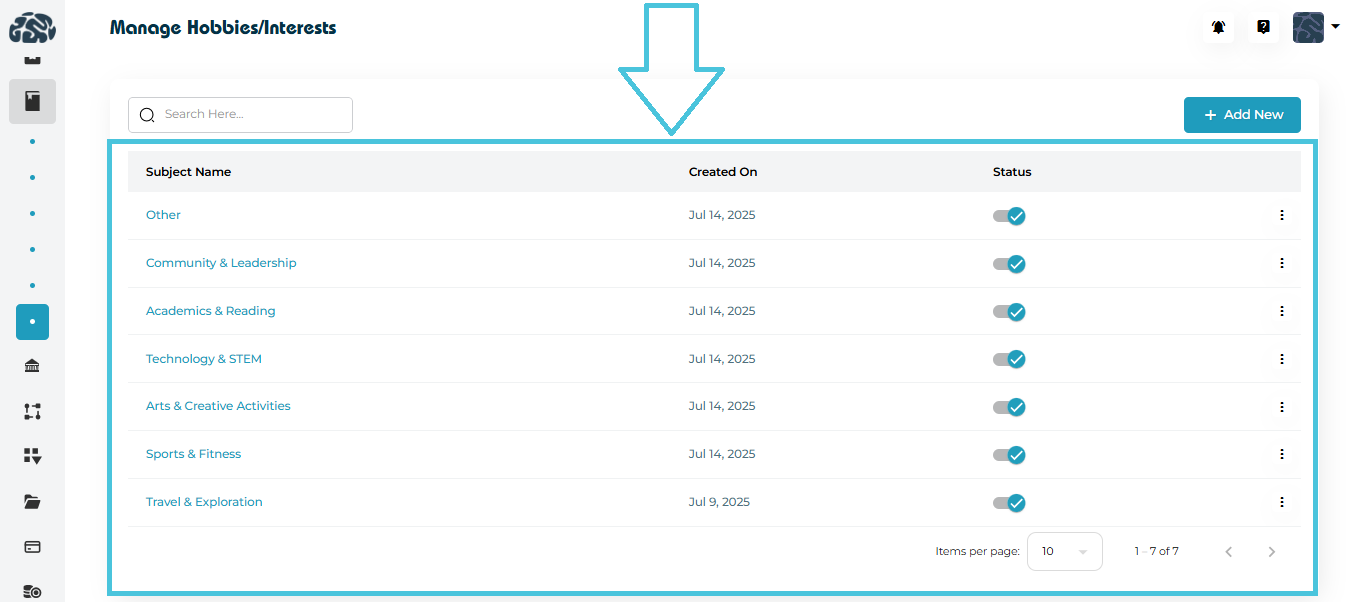 This section lets you add, edit, view, activate/deactivate, and delete hobby categories, ensuring your list remains accurate and relevant.