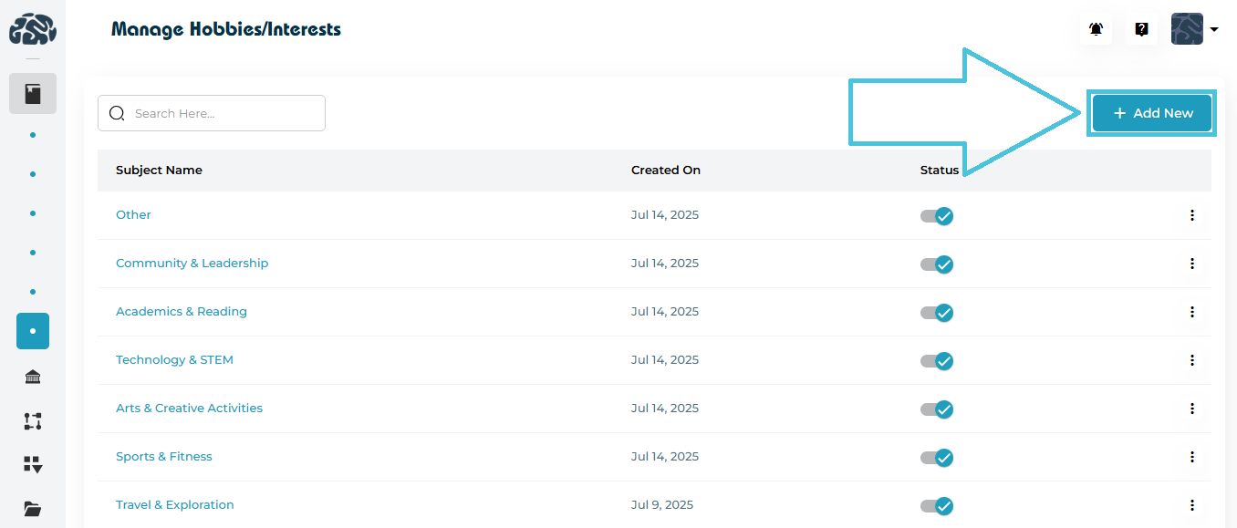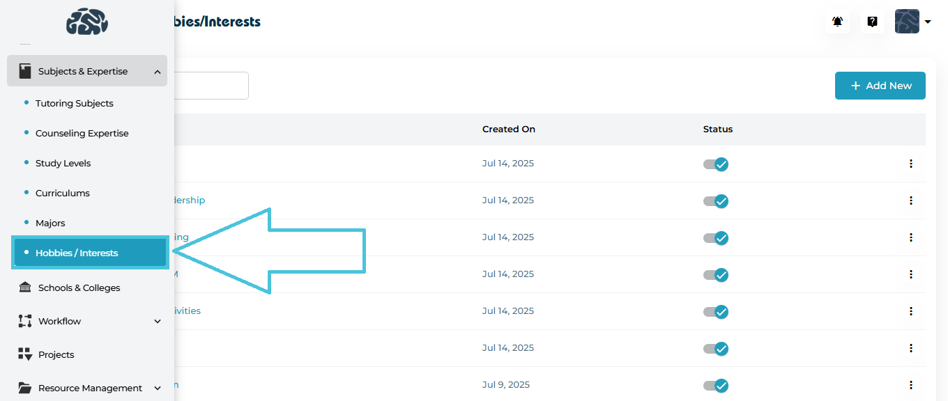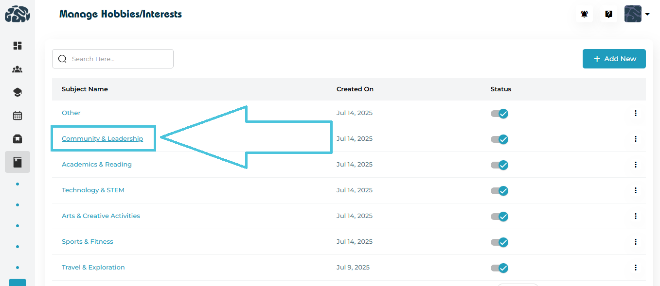 The Hobbies & Interests module allows Admins to define the extracurricular categories that students can select in their profiles. These categories help instructors, counselors, and the system better understand a student’s passions, personality, and non-academic inclinations.