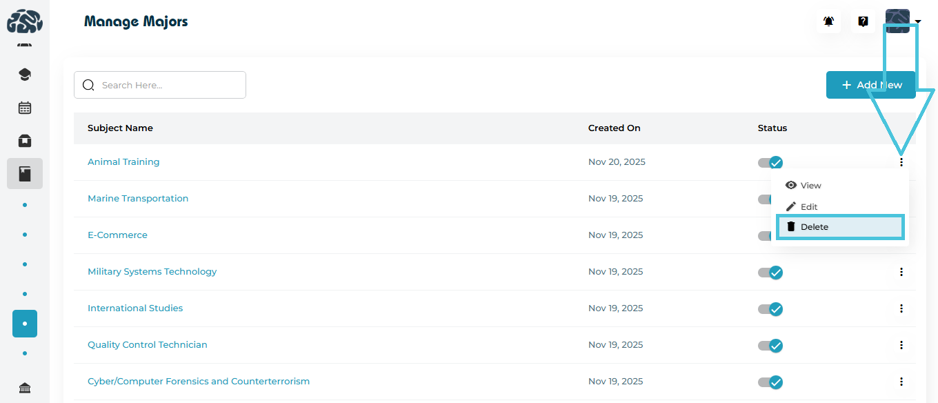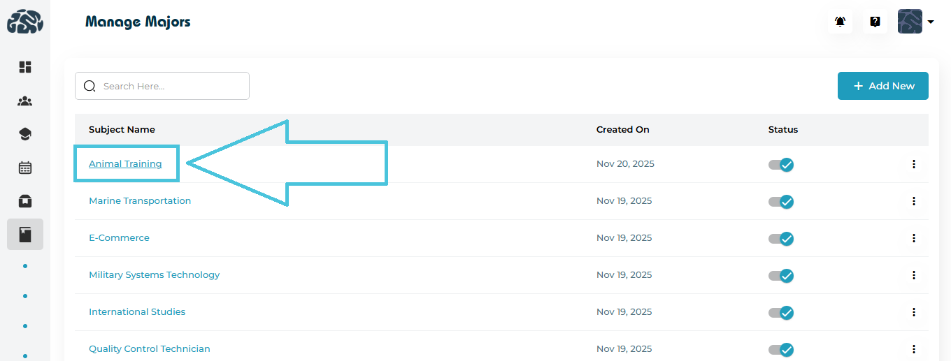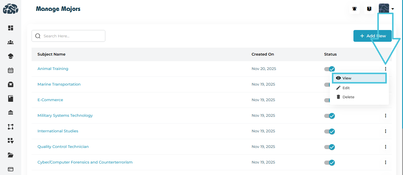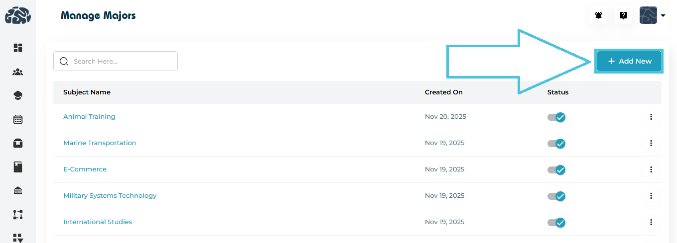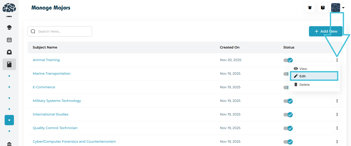 This guide explains how to add, edit, delete, activate/deactivate, and view majors, with clear screenshots to help you understand every feature.