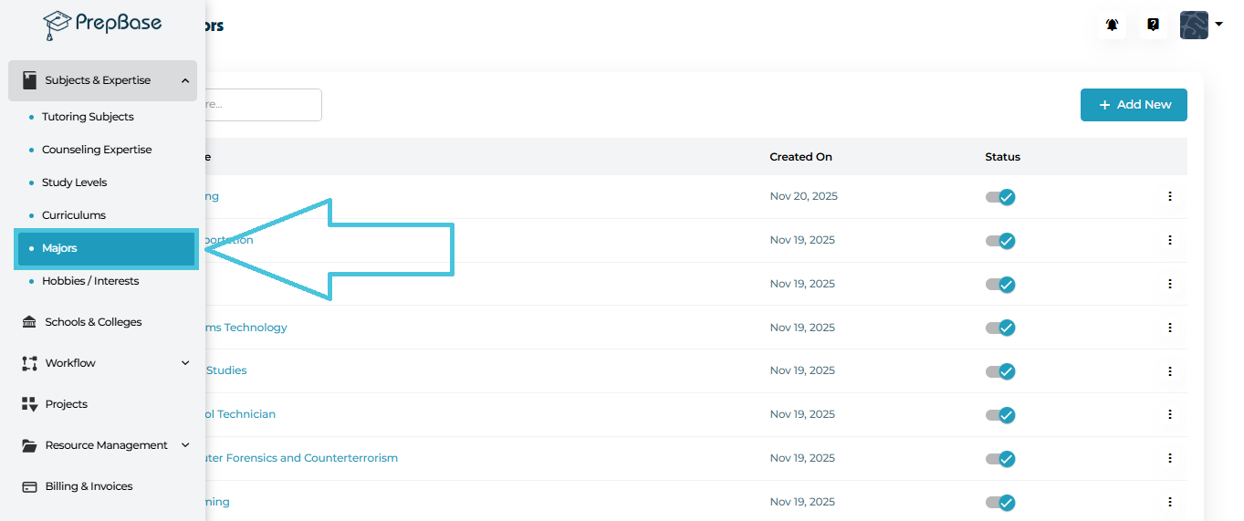 The Majors module in PrepBase allows administrators to define, organize, and manage all academic majors offered within the platform. These majors are later used across student profiles, college records, course alignment, and reporting — making it essential that this list is well-structured and kept up to date.
