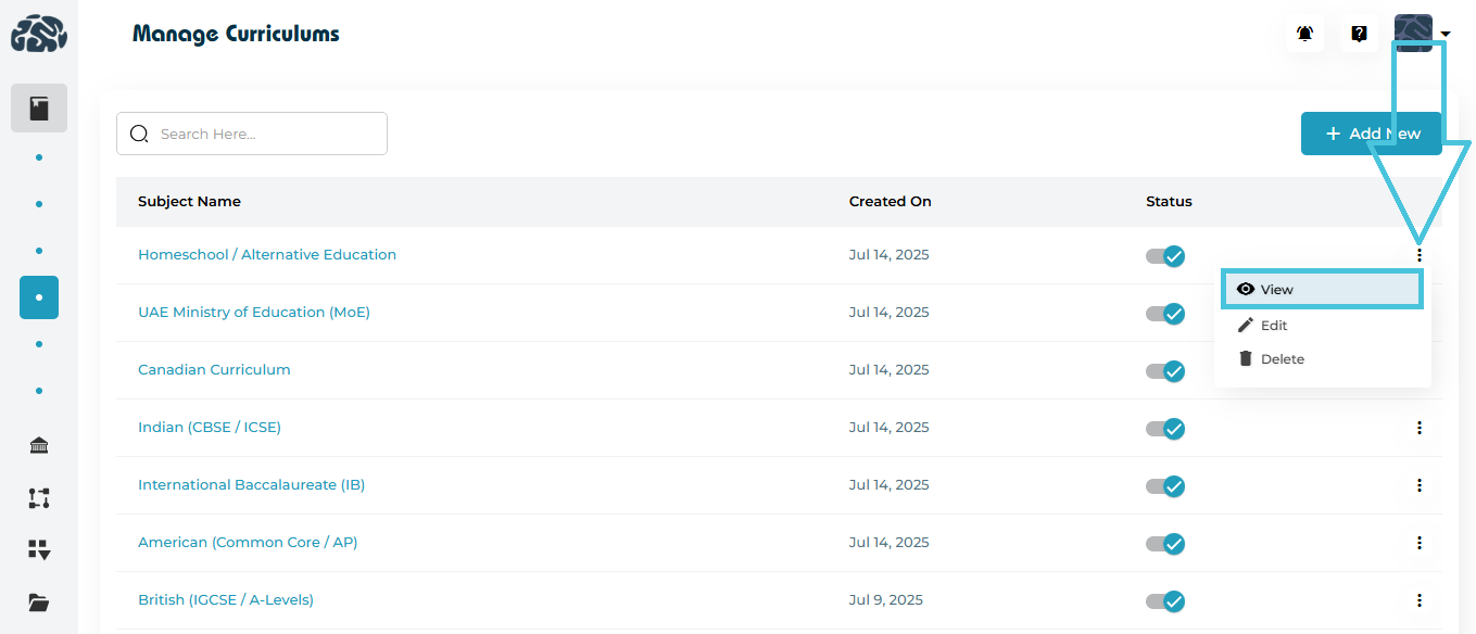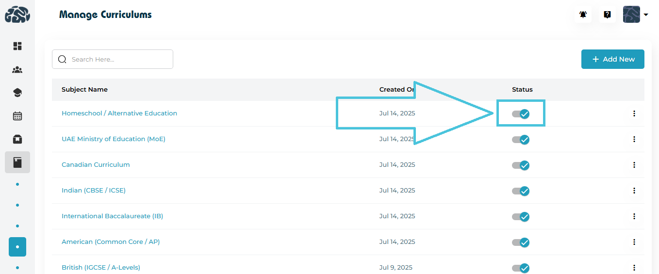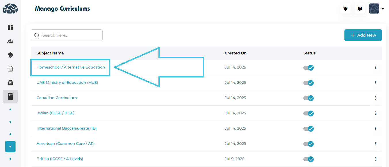 Here you’ll find the full list of curriculums your institution supports (e.g., IB, British, American, CBSE, Canadian, Homeschool, etc.).