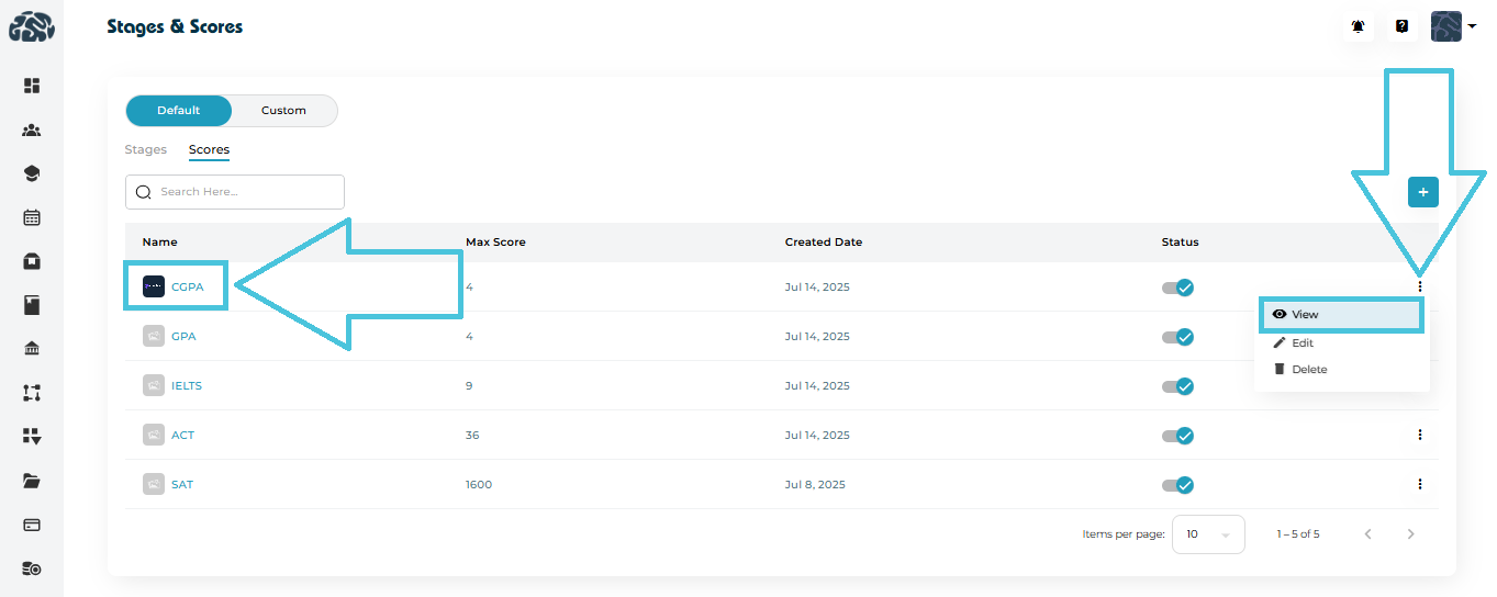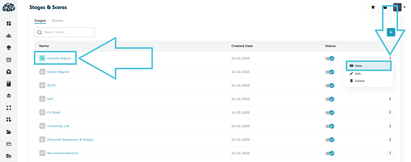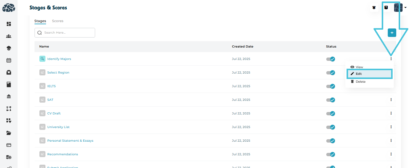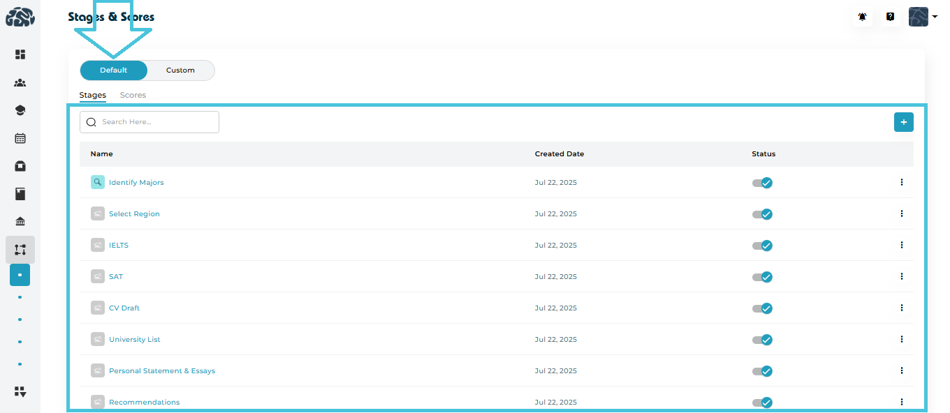 The Stages & Scores module in PrepBase allows administrators to define, customize, and manage structured admission workflows. These workflows help track a student’s progress across different stages of their academic or admissions journey while attaching measurable evaluation scores at relevant points.