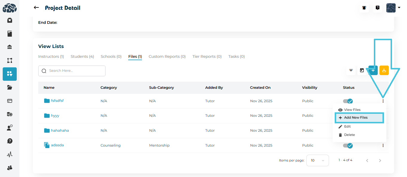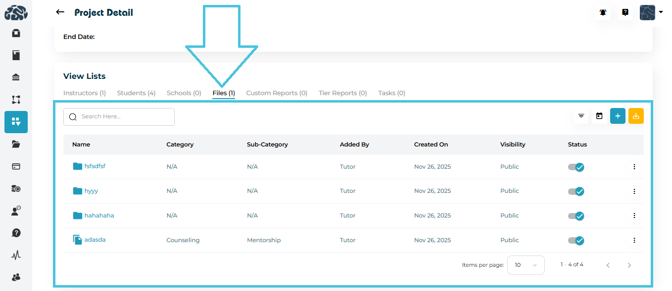 The Files tab is used to store and organize all documents related to a project, such as reports, resources, submissions, and reference material.