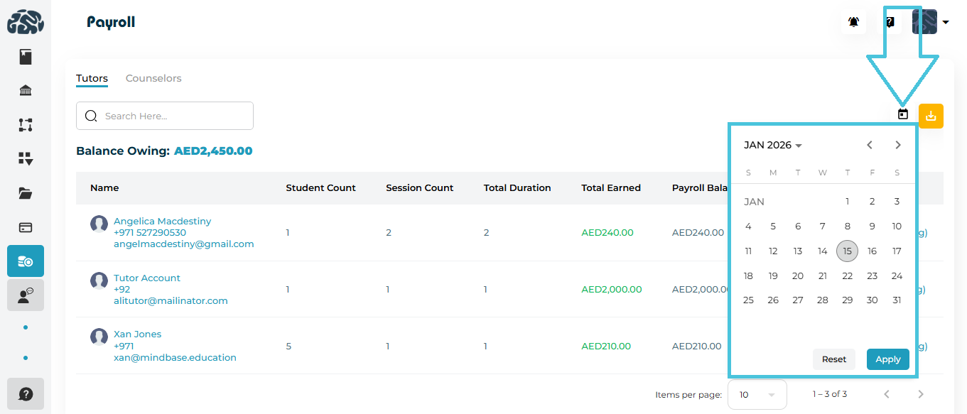 The Sessions Report provides comprehensive visibility into tutoring and counseling sessions conducted over a selected period. It enables users to analyze session activity across projects, schools, students, tutors, and session classifications.