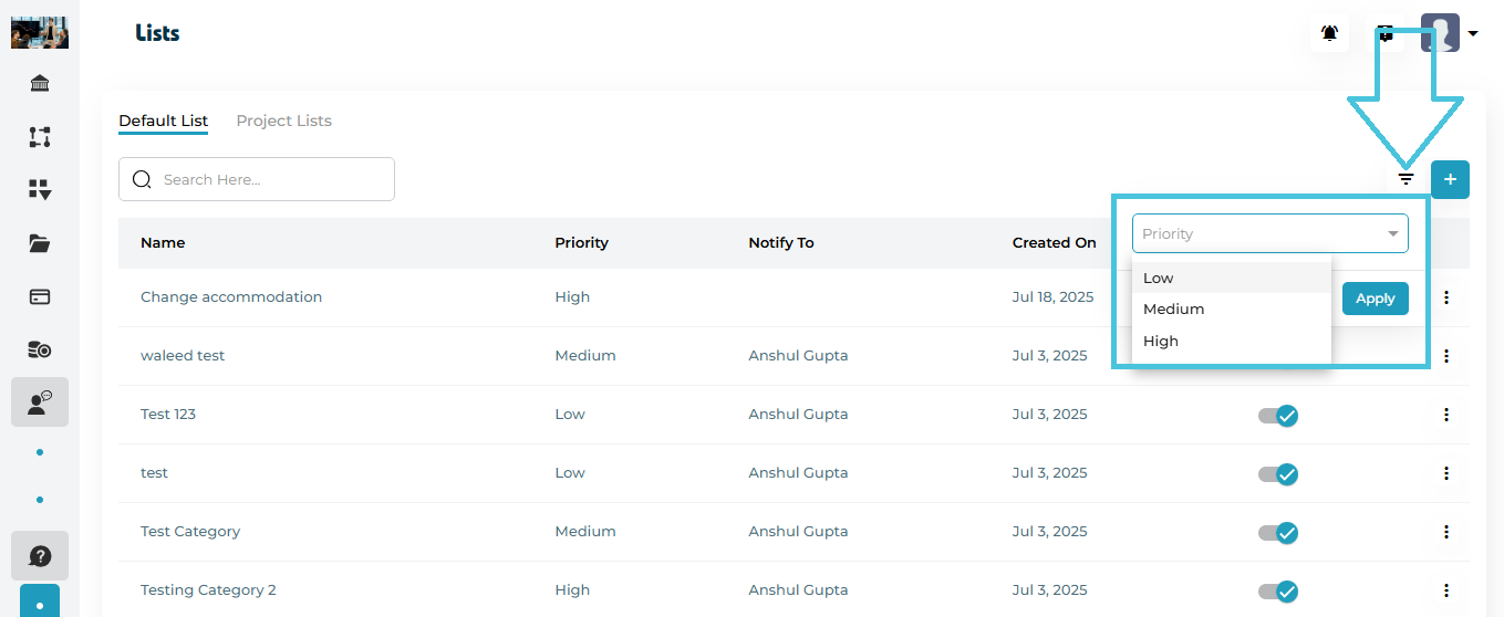 Filter Panel – Filter tickets by priority and status
