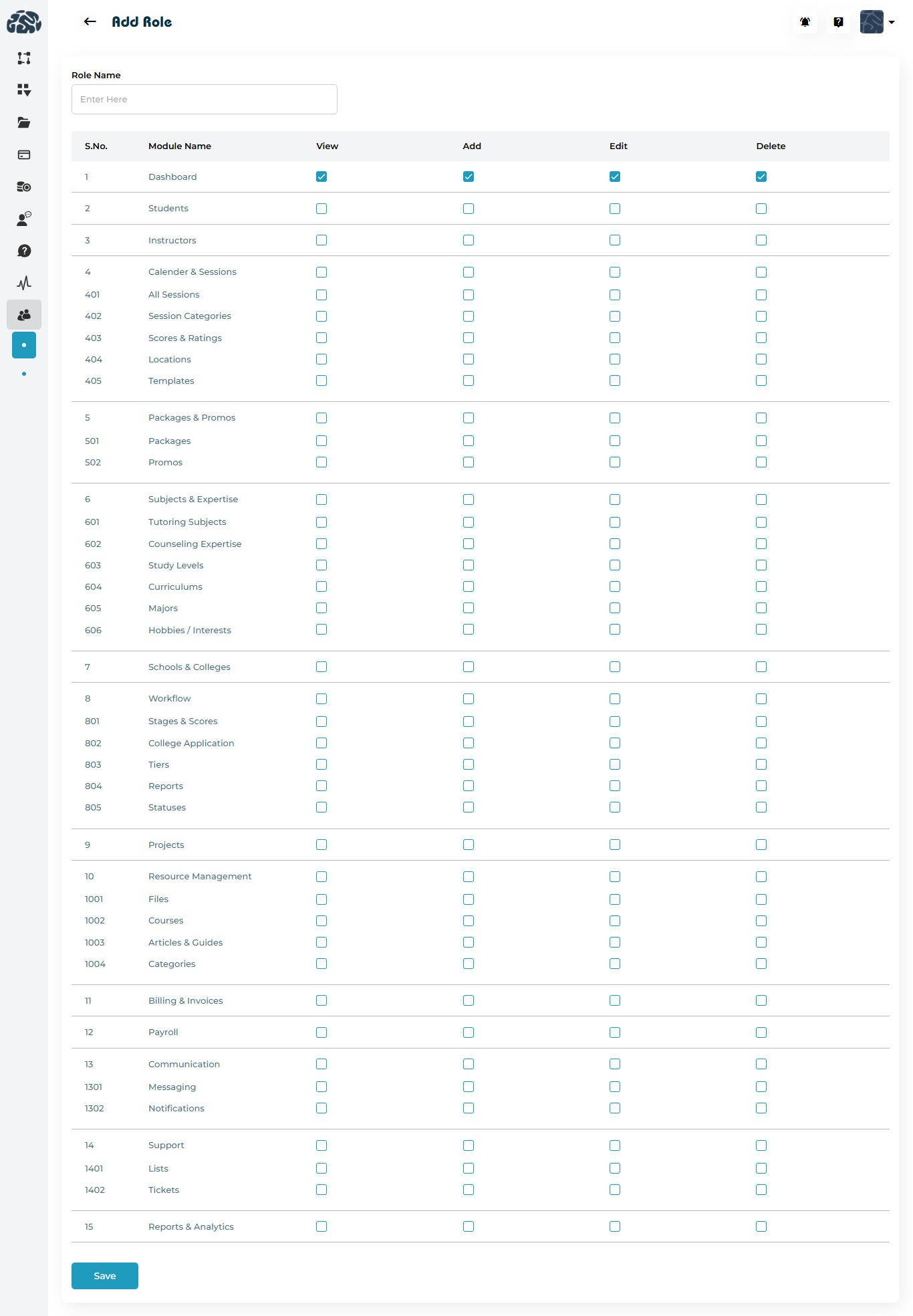 The Roles feature in PrepBase allows Super Admins to define permission levels for admin users. Roles determine what modules and actions a user can access, including: